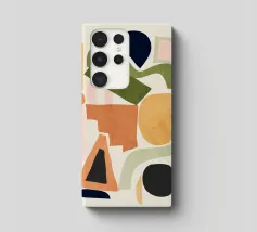 A modern and playful abstract composition featuring a gridlike arrangement of colorful, organic shapes. The artwork feels like a sophisticated and balanced puzzle of form and color.