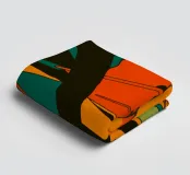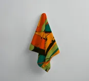 Un motivo astratto dinamico e lunatico di forme di foglie sovrapposte in una calda tavolozza autunnale di arancione, verde e nero. L'opera è energica e piena di movimento organico.