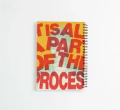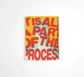 "La frase 'IS ALL A PART OF THE PROCESS' (Tutto fa parte del processo) è disposta in un layout dinamico e leggermente caotico, con caratteri tipografici rossi e afflosciati su uno sfondo giallo, con una sottile silhouette dietro il testo. La texture ruvida e le forme imperfette delle lettere creano un senso di autenticità e resilienza",