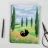 Gatto nero giocoso in un campo di grano con cipressi - Illustrazione colorata in stile Van Gogh