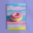 Ciambella giallo-rosa con glassa bianca galleggia davanti a un cielo blu pastello con nuvole rosa. Composizione giocosa con effetto movimento, colori vivaci e stile fantasioso. Perfetta per decorazioni moderne, fotografia di prodotto o spazi creativi.