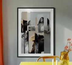 Collage con strumenti di design analogici e digitali in un'estetica da rivista di moda.