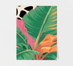 Una composizione moderna e astratta caratterizzata da un patchwork di vari motivi e forme. Gli elementi includono forme organiche simili a foglie, griglie geometriche e texture astratte in una tavolozza tenue di rosa, nero e beige, che riflette uno stile bohémien ed eclettico.