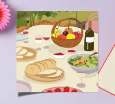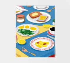 Vista dall'alto di una tavola imbandita con vari tipi di pane, dolci, formaggi e bevande, su una tovaglia a scacchi. Suggerisce un pasto rustico e abbondante.