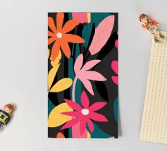 Un motivo semplice e allegro di margherite stilizzate in vari colori su uno sfondo scuro crea un disegno floreale classico, bello e senza tempo.
