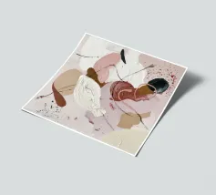 Una composizione astratta costruita con forme stratificate che suggeriscono foglie e motivi tessili, in una sofisticata tavolozza di blu, terracotta, beige, bianco e un sottile accenno di rosso.