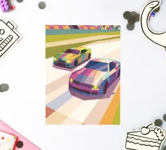 Get an illustration of a colorful bumper car in a game arena with a modern geometric style.