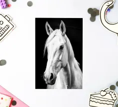 Un'immagine surreale in bianco e nero di una donna in abito di pizzo che si trova di fronte a una gigantesca testa di cavallo con texture screpolate, che crea un'atmosfera onirica e stimolante in un cielo nuvoloso.