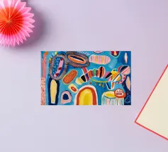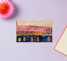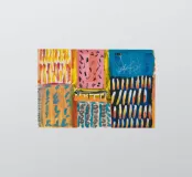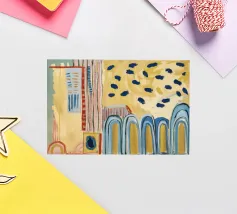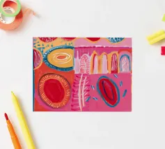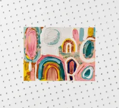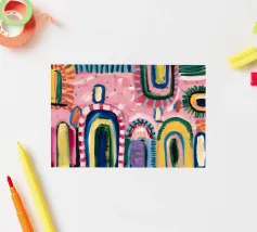 Un patchwork di motivi diversi, tra cui linee e forme a U, nei vivaci colori giallo, blu, rosa e rosso, crea un colorato effetto mosaico in questo pezzo astratto.