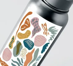 Adesivi realizzati in film PP/PET con laminazione protettiva e diverse tipologie di superficie.