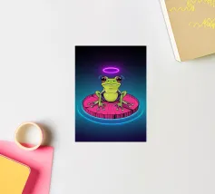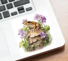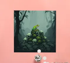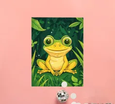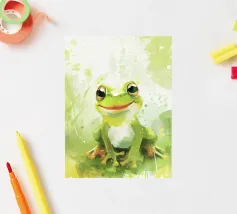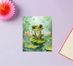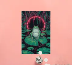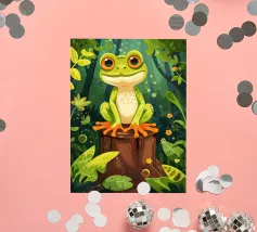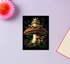 A vivid and whimsical scene featuring a bright pink frog sitting atop a red toadstool with white spots, surrounded by lush foliage and glowing flowers in a misty, enchanted forest. The magical ambiance enhances the surreal beauty.