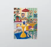 A vibrant patchwork kitchen with yellow table, tea set, and art bursts with domestic color.