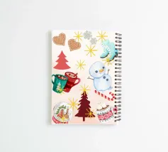 Un'illustrazione giocosa e natalizia in stile acquerello con deliziosi motivi come un pupazzo di neve, pattini da ghiaccio, tazze di cioccolata calda, bastoncini di zucchero, cuori di pan di zenzero e abeti. Scintille di stelle dorate e fiocchi di neve sono sparsi liberamente sullo sfondo chiaro, conferendo alla scena una calda e accogliente atmosfera invernale e natalizia.