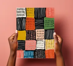 Una vibrante composizione astratta che ricorda una trapunta patchwork, con vari blocchi di colore, motivi geometrici e texture che creano un disegno vivace e tattile.