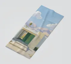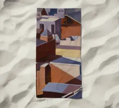La geometria spoglia di una passerella coperta è definita da audaci pilastri cremisi e dalle ombre lunghe e nette che proiettano nella luce del sole. Questo dipinto è un potente studio di luce, ombra, colore e forma architettonica.