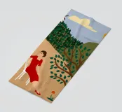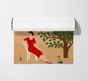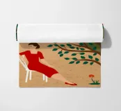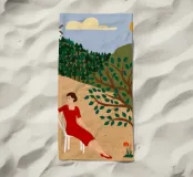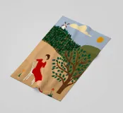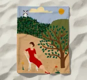 Illustrazione di una donna in abito rosso, seduta in un campo con un ulivo e un mulino a vento sullo sfondo. La scena è una rappresentazione serena, pittoresca e senza tempo di una tranquilla giornata in campagna.