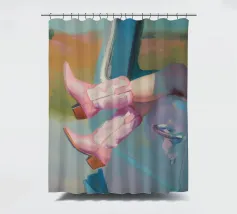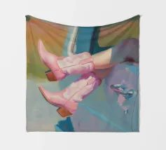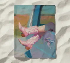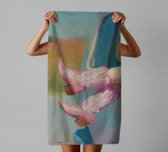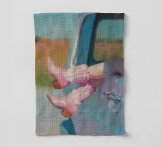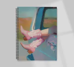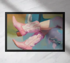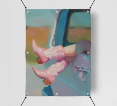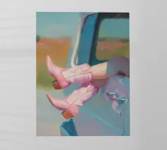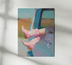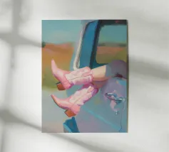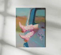 Il motivo mostra uno scenario elegante ed estivo con un tocco di libertà e avventura. Una persona con stivali da cowboy rosa si rilassa con le gambe fuori da un'auto turchese: i colori vivaci e le pennellate morbide conferiscono alla scena un'atmosfera calda e sognante. Questa immagine cattura perfettamente la sensazione di un viaggio in macchina, di sole e di spensieratezza.