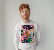 Una natura morta astratta giocosa e colorata con forme decostruite che rappresentano frutta, foglie e vasi. La composizione energica e la tavolozza vivace creano un'interpretazione gioiosa e moderna di un tema classico.