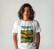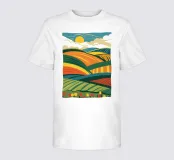 A vibrant landscape of bountiful, rolling fields of crops under a sunny sky with fluffy clouds. The stylized, colorful depiction of the countryside celebrates the beauty and abundance of agricultural land.