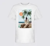 Grazioso dipinto digitale di una donna sicura di sé in una fluente vestaglia bianca seduta su una spiaggia rocciosa con palme e un vibrante sole arancione. Questa elegante e serena scena costiera evoca lusso, calma e vibrazioni tropicali. Perfetto per gli amanti della moda, dell'arte moderna e dell'arredamento tropicale. Aggiunge raffinatezza e calore a soggiorni, camere da letto e uffici. Regalo ideale per i collezionisti d'arte e gli appassionati di ritratti contemporanei ispirati alla spiaggia.
