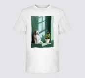 A peaceful white cat sits on a sunlit windowsill, watching butterflies flutter above a cactus in bloom. Soft shadows and green tones create a tranquil, dreamlike mood—perfect for adding calm and warmth to any space.