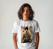 Collage di una donna asiatica con fiori circondata da farfalle