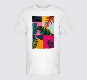 A sophisticated composition combines blocks of tropical leaf patterns with solid color fields and geometric shapes. The patchwork design in shades of blue, pink, and green creates a balanced and stylish piece that is both modern and natural.