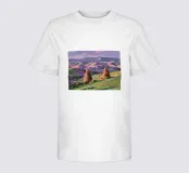 Un paesaggio sereno incentrato su un pagliaio ben formato che si erge in un campo caratterizzato da dolci colline dai toni tenui del viola e del verde, il tutto sotto un cielo morbido e tranquillo.