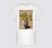 Una natura morta fresca e vivace con un vaso di ceramica pieno di rami di limone. Con i suoi toni caldi e lo sfondo minimalista, quest'opera d'arte porta il fascino mediterraneo e la bellezza naturale in qualsiasi cucina o spazio abitativo.