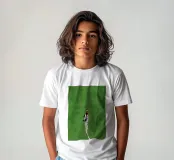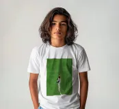 Eine einzelne Figur läuft barfuß über eine riesige grüne Fläche – doch ihre Spur ist aus glitzerndem Wasser. Wie ein Riss im Alltag zieht sich die schmale Wasserbahn durch das Bild und lässt Realität und Surrealismus ineinanderfließen. Mit entschlossenen Schritt verkörpert die Figur Freiheit, Ungewöhnlichkeit und die Kunst, den eigenen Weg zu finden.