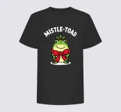 Un allegro rospo verde è ornato da un festoso fiocco rosso, seduto felicemente sotto la scritta "Mistle-Toad". La scena suggerisce un tema natalizio giocoso, con il vischio posizionato sopra la testa del rospo.