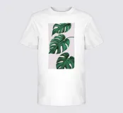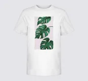 Un'illustrazione ravvicinata incentrata sulle iconiche foglie fenestrate di una pianta di monstera su uno sfondo rosa pallido. La composizione è uno studio semplice, elegante e minimalista di una forma naturale molto amata.