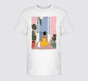 A quiet evening scene of a woman and her cat sitting by open doors, surrounded by lush plants and soft moonlight. The gentle composition feels dreamy and feminine with clean lines and pastel calm. Made to bring a little hush and slow living energy to your day.