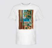 Una vista attraverso una finestra di un bellissimo albero di arance, carico di frutti maturi. La luce calda e solare e l'affascinante soggetto creano una scena di rustica abbondanza mediterranea.