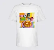 A delicious stack of golden brown pancakes, topped with a melting pat of butter and drizzled with syrup, is the star of this artwork. Presented with colorful mugs, the illustration is a mouth watering celebration of a classic, beloved breakfast treat.