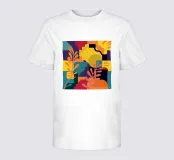 A bold abstract composition of stylized leaves and geometric shapes in primary colors of yellow, red, and blue, creating a vibrant and structured design.