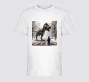 Un enorme T-Rex sovrasta un bambino in una scena di città invernale, circondato da strade innevate e alti edifici. L'incontro surreale contrappone la potenza preistorica a un moderno paesaggio urbano.