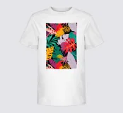 Un motivo coloratissimo di fiori e foglie tropicali in rosa, rosso, arancione e verde acqua, che crea una festa visiva gioiosa ed energica.