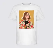 Questa opera d'arte raffigura una persona con capelli corti e biondi che indossa una giacca floreale e tiene in mano un libro. Lo sfondo giallo brillante ne esalta l'essenza chic ed elegante.