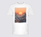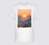 Un ipnotico paesaggio marino astratto che raffigura un sole che tramonta su onde ondulate e fluenti. Le vibranti tonalità arancioni si fondono perfettamente con i blu freddi, creando un'atmosfera serena e mozzafiato.