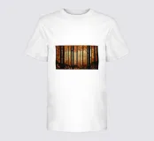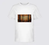 Il dipinto digitale di una foresta autunnale presenta sagome scure di alberi su uno sfondo caldo e dorato. L'opera d'arte testurizzata mostra un fogliame dettagliato nei toni dell'arancione e del marrone, creando una scena di bosco serena e suggestiva.