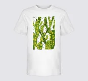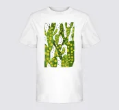 Un disegno stilizzato e ravvicinato di un cactus fico d'India mostra i suoi cuscinetti verdi e le sue macchie gialle in un disegno grafico e vibrante, che cattura la consistenza unica della pianta del deserto.