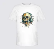 Illustrazione digitale dettagliata di un teschio umano che indossa grandi cuffie, su uno sfondo arancione vivo con effetti splatter. Il teschio sembra apprezzare la musica, aggiungendo un'atmosfera moderna e tagliente al design.