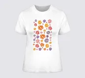 Un motivo floreale giocoso che sembra una passeggiata visiva in un festival di giardini retrò: I fiori stilizzati, nei colori arancione, rosa, viola, rosso e giallo, danzano liberamente. Ogni fiore ha una forma semplice, simile a una margherita, con lunghi petali a raggiera che emergono da un punto centrale. La disposizione è volutamente irregolare, come un disegno sparso di gioia, estate e nostalgia.