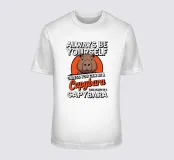 Una simpatica illustrazione di capibara circondata da un testo motivazionale. Le parole incoraggiano l'individualità con un tocco umoristico, evidenziando il fascino dei capibara.
