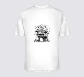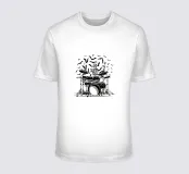 Illustrazione di uno scheletro percussionista che suona una batteria, in una tavolozza nera e grigia con accenti bianchi. Uno stile scuro e diretto, ideale per magliette rock e goth e abbigliamento dark.