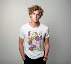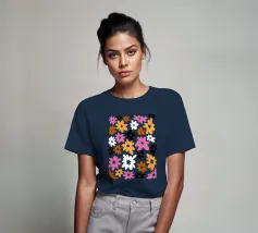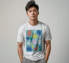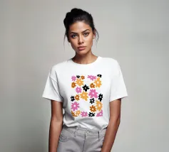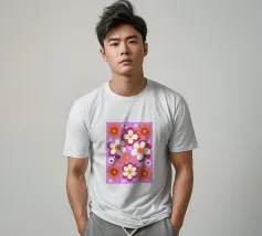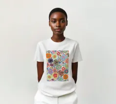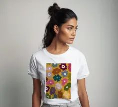 Un motivo floreale giocoso che sembra una passeggiata visiva in un festival di giardini retrò: I fiori stilizzati, nei colori arancione, rosa, viola, rosso e giallo, danzano liberamente. Ogni fiore ha una forma semplice, simile a una margherita, con lunghi petali a raggiera che emergono da un punto centrale. La disposizione è volutamente irregolare, come un disegno sparso di gioia, estate e nostalgia.