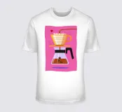 Illustrazione grafica di una caffettiera in azione, su uno sfondo rosa intenso. La rappresentazione moderna e stilizzata è un perfetto omaggio all'arte e al rituale del caffè speciale.