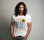 CIAO CIAO con arance su sfondo beige. È perfetto per poster, magliette, teli da mare, accessori per le vacanze, decorazioni estive e articoli lifestyle. Questo motivo porta un tocco fresco e italiano nella vita di tutti i giorni ed è perfetto per l'estate, le vacanze al mare o come regalo. Che sia per una vacanza, per la spiaggia o semplicemente come accessorio di stile, questo motivo assicura il buon umore e un tocco di sole.