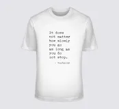 Una frase che rimane impressa. Questo poster riassume con chiarezza tipografica una delle più famose parole di saggezza di Confucio: "Non importa quanto lentamente vai, purché tu non ti fermi". - Un promemoria di pazienza, perseveranza e forza tranquilla. Il carattere Typewriter conferisce alla citazione un'aura senza tempo, quasi letteraria. Nero su bianco, semplice e diretto, come un pensiero scritto a macchina. Niente fronzoli, niente rumore: solo significato.